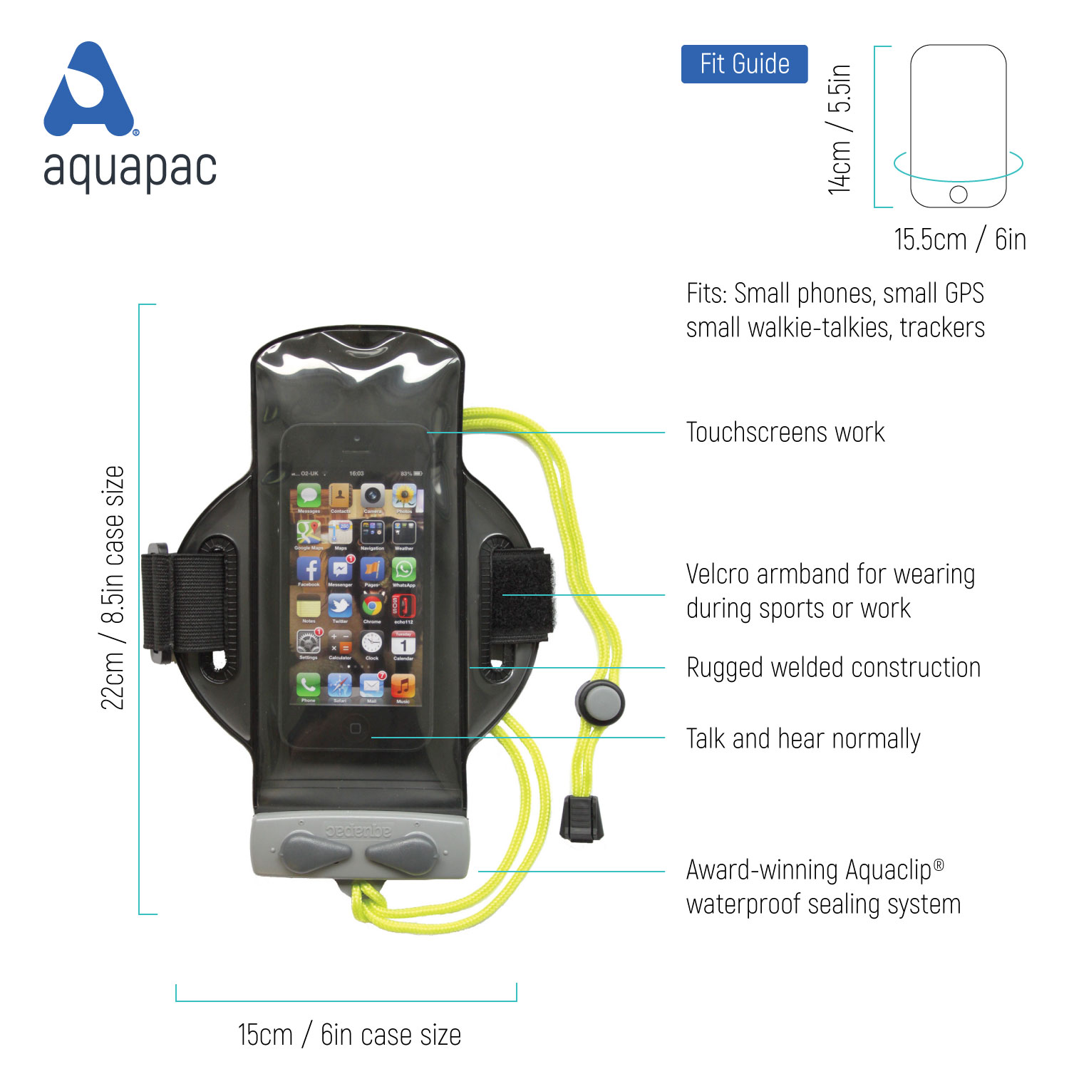 Sie telefonieren durch die klare Front der Vorderseite Oder lesen Ihren GPS-Logger ab. Wie schnell waren Sie mit Ihrem Board auf den Wellen unterwegs? Empfang (auch Bluetooth), Sprechen, Hören, Klingelton, GPS-Signal und Bedienung auch eines Touchscreens ist kein Problem. Auch Unterwasser. Befestigung mit dem flexibel einstellbaren Klettverschluss am Oberarm. Alternativ auch mit einem zusätzlichen Neopren-Hüftgurt; verstellbar, 7 Schlaufen zum Befestigen ihrer Ausrüstung, 125 Zentimeter lang. schwimmfähig mit Handy oder GPS. garantiert 100% wasserdicht bis 10 Meter Wassertiefe. Das UV-stabilisierte TPU-Material wird durch Sonneneinwirkung nicht brüchig oder gelb. schützt auch gegen Staub und Sand. Und auch gegen Sonnencreme. Ausgeliefert wird: mit elastischem Armgurt zur Befestigung am Arm oder am Equipment. mit einer verstellbaren Schlaufe. So können Sie das Aquapac um den Hals oder der Schulter tragen.wahlweise mit einem Neopren-Gürtel (tactical loop), 125 Zentimeter lang Karabiner zum Tragen an der Kleidung sowie Trockenmittel gegen Beschlagen sind als Extra erhätlich.Inhalt nicht im Lieferumfang enthalten.Welche Größe passt? Die Tasche ‚PRO Sports’ passt für normal große Handys, GPS und LPD/PMR446 Handfunkgeräte. Um herauszufinden, ob ihr Gerät passt, messen Sie bitte und vergleichen mit der Grafik unten. Oder schauen Sie auf das Pro Sport mini. Der Armgurt hat eine Länge von 33 Zentimeter, gezogen bis 45 Zentimeter. Der zusätzlich verfügbare Hüftgurt ist verstellbar und 125 Zentimeter lang. Abmessungen: Abmessung größtmögliches Gerät Abmessung Tasche maximale Länge des Geräts: 180mmmaximaler Umfang: 190mm Ihr GPS ist wasserdicht? Für einige „wasserdichte“ GPS gilt: Ein schwimmfähiges GPS kann ein Bad überleben, wenn Sie es augenblicklich wieder auffischen. Nach fünf Minuten brauchen Sie gar nicht weiter zu suchen. Denn selbst wenn das Gerät noch schwimmt: Funktionieren wird es in den seltensten Fällen. Fällt das (warme) Gerät ins (relativ kalte) Nass, dann entsteht im Gehäuse Unterdruck. Der saugt Wasser durch kleinste Ritzen und überwindet dabei sogar einfache Dichtungen. Die Folie unseres AQUAPAC überwindet es nicht. Haben Sie auch schon einmal bedacht, dass die salzhaltige Luft am Meer Ihr Gerät angreift und zu Korrosion führt? Unser Aquapac schützt davor. Die AQUAPACs wurden vom British Standards Institute (BSI, vergleichbar DIN) getestet und erfüllten die Norm IP68. Die Taschen sind 100% wasser- und luftdicht. Übrigens auch ein cleveres Geschenk für Wassersportler und solche, die gern draußen unterwegs sind. Unsere Kategorisierung: Tauchen und Schnorcheln: Die Taschen dieser Kategorie sind nach der IPX8-Norm vom Engineering Research Center am Imperial College, London, getest: das heißt, kontinuierliches Untertauchen nach Auswahl des Herstellers. Aquapac hat unter den Bedingungen von einer Stunde in fünf Meter Wassertiefe testen lassen - und natürlich bestanden. Schwimmen und Schnorcheln und Filmen im Regen steht also nichts mehr im Wege (unsere Taschen sind auch schon tagelang im Wasser getrieben, ohne das Wasser eingedrungen ist). Was hält das Wasser draußen? Der patentierte Aquaclip® versiegelt die Tasche – mit einem einfachen Dreh an den Hebeln. Er wurde nach den härtesten internationalen Standards für Wasserdichtigkeit getestet. Im Einsatz Wenn Sie Wasser- oder Radsport betreiben ist es manchmal wichtig, ein Handy oder GPS dabei zu haben. Der wichtigste Grund wird Ihre Sicherheit sein. Sie können Hilfe herbeirufen, wenn Sie in Not geraten. Umso wichtiger ist, dass es im Notfall auch wirklich funktioniert. Und beim Sport wollen Sie sich frei bewegen können und die Hände frei haben, also müssen Sie das Handy oder GPS befestigen können. Oder aber Sie sind Speedsurfer. Haben Ihr Locosys oder andere GPS Data Logger und wollen wissen, wie schnell Sie sind? Einfach das Gerät ins Pro Sports, um den Arm schnallen und losbrettern. Schon während der Fahrt können Sie schauen, wie schnell Sie unterwegs sind. Ein Muss für alle Speedsurfer. Wasserdichte Taschen werden zum Schutz des Locosys empfohlen, da es nur gegen Spritzwasser geschützt ist. Das robuste PRO Sports bietet garantiert 100% wasserdichten Schutz für Ihr Handy oder GPS und lässt Sie Ihre Elektronik am Arm tragen, bedienen und ablesen. Ist das Gerät erst einmal sicher im AQUAPAC verstaut, können Sie sie überall mit hinnehmen, was auch immer Sie vorhaben. Was wollen Sie mehr.