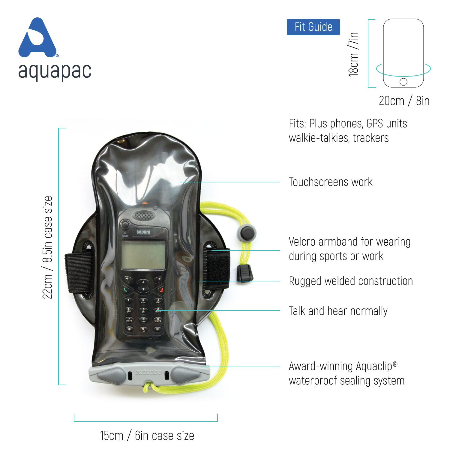 Sie telefonieren durch die klare Front der Vorderseite. Empfang (auch Bluetooth), Sprechen, Hören, Klingelton, GPS-Signal, Bedienung auch des Touchscreens sind kein Problem. Auch Unterwasser.* schwimmfähig mit Handy oder GPS. Befestigung mit dem flexibel einstellbaren Klettverschluss am Oberarm. Alternativ auch mit einem zusätzlichen Neopren-Hüftgurt mit 7 Schlaufen zum Befestigen ihrer Ausrüstung, verstellbar, 125 Zentimeter lang. garantiert 100% wasserdicht bis 10 Meter Wassertiefe. Das UV-stabilisierte TPU-Material wird durch Sonneneinwirkung nicht brüchig oder gelb. Die Tasche schützt auch gegen Staub und Sand. Und auch gegen Sonnencreme.Auch für Ihr CGM geeignet. Ausgeliefert wird: mit elastischem Armgurt zur Befestigung am Arm oder am Equipment. mit einer verstellbaren Schlaufe. So können Sie die Tasche um den Hals oder der Schulter tragen. Oder befestigen, wo immer Sie wollen. Schnapphaken zum Tragen an der Kleidung ist als Extra erhältlich.Inhalt nicht im Lieferumfang enthalten.Was passt? Die Tasche ‚PRO Sports Mini’ passt für die derzeit gängigen Handys und Smartphones wie die kleinen iPhone oder Galaxy, für GPS und LPD/PMR446 Handfunkgeräte. Um herauszufinden, ob Ihr Gerät passt, schauen Sie bitte auf die Grafik unten. Der Armgurt hat eine Länge von 33 Zentimeter, gezogen bis 45 Zentimeter. Der zusätzlich verfügbare verstellbare Hüftgürtel hat eine Länge von 115 Zentimeter.Etwas länger und breiter als diese Armgurt-Tasche ist das AQUAPAC PRO Sport. Abmessungen: Abmessung größtmögliches Gerät Abmessung Tasche maximale Länge des Geräts: 145mmmaximaler Umfang des Geräts: 155mm Ihr GPS ist wasserdicht? Für einige „wasserdichte“ GPS gilt: Ein schwimmfähiges GPS kann ein Bad überleben, wenn Sie es augenblicklich wieder auffischen. Nach fünf Minuten brauchen Sie gar nicht weiter zu suchen. Denn selbst wenn das Gerät noch schwimmt: Funktionieren wird es selten noch. Fällt das (warme) Gerät ins (relativ kalte) Nass, dann entsteht im Gehäuse Unterdruck. Der saugt Wasser durch kleinste Ritzen und überwindet dabei sogar einfache Dichtungen. Die Folie unseres AQUAPAC überwindet es nicht. Und: Die Tasche schwimmt mit Inhalt. Unsere Kategorisierung: Tauchen und Schnorcheln: Die Taschen dieser Kategorie sind nach der IPX8-Norm vom Engineering Research Center am Imperial College, London, getest: das heißt, kontinuierliches Untertauchen nach Auswahl des Herstellers. Aquapac hat unter den Bedingungen von einer Stunde in fünf Meter Wassertiefe testen lassen - und natürlich bestanden. Schwimmen und Schnorcheln und Filmen im Regen steht also nichts mehr im Wege. Falls Sie unsicher sind, dass nur eine Stunde getestet wurde: Unsere Taschen sind auch schon tagelang im Wasser getrieben, ohne das Wasser eingedrungen ist. Was hält das Wasser draußen? Der patentierte Aquaclip® versiegelt die Tasche – mit einem einfachen Dreh an den Hebeln. Er wurde nach den härtesten internationalen Standards für Wasserdichtigkeit getestet. Wenn Sie noch keinen Aquaclip gesehen haben, erfahren Sie hier mehr. Im Einsatz: Wenn Sie Wasser- oder Radsport betreiben, ist es manchmal wichtig, ein Handy oder GPS dabei zu haben. Der wichtigste Grund wird Ihre Sicherheit sein. Sie können Hilfe herbeirufen, wenn Sie in Not geraten. Umso wichtiger ist, dass es im Notfall auch wirklich funktioniert. Das robuste PRO Sports Mini bietet garantiert 100% wasserdichten Schutz für Ihr Handy oder GPS und lässt Sie Ihre Elektronik am Arm tragen, bedienen und ablesen. Sie haben die Arme frei für den Sport. Haben Sie auch schon einmal bedacht, dass die salzhaltige Luft am Meer Ihr Gerät angreift und zu Korrosion führt? Unser Aquapac schützt davor. Die AQUAPACs wurden vom British Standards Institute (BSI, vergleichbar DIN) getestet und erfüllten die Norm IP68. Die Taschen sind 100% wasser- und luftdicht. Ist das Gerät erst einmal sicher im AQUAPAC verstaut, können Sie sie überall mit hinnehmen, was auch immer Sie vorhaben. Ist das nicht klasse? Übrigens auch ein cleveres Geschenk für Wassersportler und solche, die gern draußen unterwegs sind. * Unterwasser funktioniert ein Touchscreen in der Regel nicht. Fotoauslösung ist daher nur über Tasten möglich. Bitte schauen Sie in die Einstellungen Ihres Smartphones. Bei Videos können Sie die Funktion oberhalb der Wasserlinie einschalten.