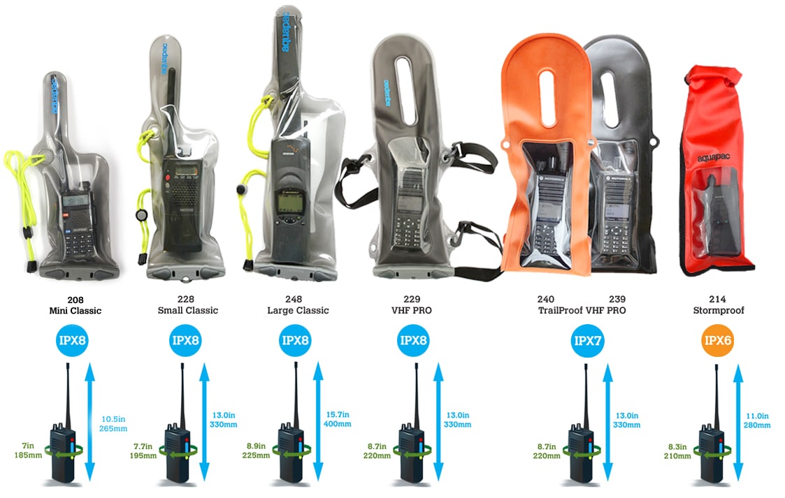 passt für Funkgeräte mit Antenne links oder rechts bis 330 Millimeter Länge. in unserer neuen grauen PVC-freien Folie. Klarsichtfenster vorn und hinten. Sie sprechen und hören durch die Tasche. Empfang (auch Bluetooth) und Bedienung sind durch die Folie kein Problem. schwimmfähig mit Handfunkgerät. garantiert 100% wasserdicht bis 10 Meter Wassertiefe gemäss IPX8. Das UV-stabilisierte TPU-Material wird durch Sonneneinwirkung nicht brüchig oder gelb. Salzwasserresistent. schützt auch gegen Staub, Sand oder Öl. Nato-Versorgungs-Nr.: 5820997305552 Ausgeliefert wird: mit einer verstellbaren Schlaufe/Lanyard. So können Sie die Tasche um den Hals tragen. Oder an der Kleidung. Oder befestigen, wo immer Sie wollen. in unserer neuen grauen Folie aus 300 Mu UV-TPU. ein Karabiner zum Tragen an der Kleidung oder Trockenmittel, um Kondenswasser zu verhindern, ist als Extra erhältlich.Inhalt nicht im Lieferumfang enthalten. Welche Größe passt?Die Tasche ‚Small VHF Classic’ passt für die meisten modernen Handfunkgeräte. Um herauszufinden, ob sie passt, messen Sie bitte und schauen in die Grafik darunter. Abmessung größtmögliches Gerät Abmessungen außen maximale Höhe des VHF inklusive Antenne: 330mmmaximaler Umfang: 195mmUnsere Kategorisierung: Tauchen und Schnorcheln: Die Taschen dieser Kategorie sind nach der IPX8-Norm vom Engineering Research Center am Imperial College, London, getest: das heißt, kontinuierliches Untertauchen nach Auswahl des Herstellers. Aquapac hat unter den Bedingungen von einer Stunde in fünf Meter Wassertiefe testen lassen - und natürlich bestanden. Ihr VHF unter extremen Bedingungen wie Sturm, Schnee, Regen oder Einsätzen zu benutzen, steht also nichts mehr im Wege (unsere Taschen sind auch schon tagelang im Wasser getrieben, ohne das Wasser eingedrungen ist). Was hält das Wasser draußen? Der patentierte Aquaclip® versiegelt die Tasche – mit einem einfachen Dreh an den Hebeln. Er wurde nach den härtesten internationalen Standards für Wasserdichtigkeit getestet. Wenn Sie noch keinen Aquaclip gesehen haben, erfahren Sie hier mehr. Im Einsatz Sie haben ein Handfunkgerät für Ihr Hobby oder im professionellen Einsatz. Ist es wasserdicht? Und ist es schwimmfähig? Falls eine oder beide Antworten ‘Nein’ lauten, brauchen Sie ein 100% wasserdichtes AQUAPAC. Ist Ihr Handfunkgerät mit einem AQUAPAC geschützt, benutzen Sie es wie gewohnt. Der luftdichte Verschluss macht das Funkgerät sogar schwimmfähig, wenn es über Bord geht. Die AQUAPACs wurden vom British Standards Institute (BSI, vergleichbar DIN) getestet und erfüllten die Norm IP68. Die Taschen sind 100% wasser- und luftdicht. Die AQ2-Serie für Funkgeräte ist bei der NATO erprobt und bei den Armeen verschiedener Nationen in Gebrauch: Das 228 hat die Nato-Versorgungsnr. 5820997305552. Was unsere Kunden sagen: "Ich benutze jetzt seit drei Jahren Aquapac Funkgerätetaschen – eine effektive Sache, um elektronische Geräte vor Korrosion zu schützen, egal ob gelagert oder in Benutzung." Julien Fudge, Indonesia "Die Aquapacs werden jetzt schon von unserem Lebensrettungs-Team am Aberdeen Beach benutzt. Und bis jetzt - brillant...!!!" Tim Hollis, President, Aberdeen Surf Rescue, UK Was die Presse sagt: "Viele Funkgeräte sind wasserresistent, aber nur wenige wasserdicht … Die neue VHF PRO Tasche von Aquapac macht da weiter, wo Wasserresistenz aufhört." Boating Life Magazine, www.boatinglifemag.com, USA