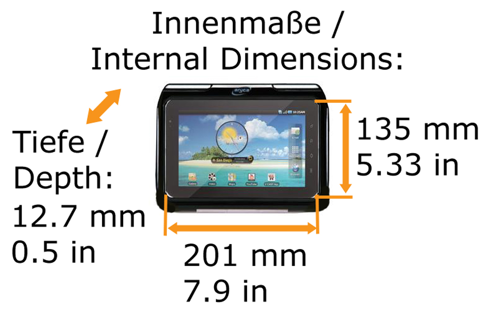 Der Aryca-Case macht ihr Mini-Tablet oder Ihren e-Book-Reader zu 100% wasserdicht und schützt es gegen Sand und Staub. Der stabile Polycarbonat-Rahmen schützt ihren teuren Liebling gegen Stöße. 7 Meter Fallhöhe ist kein Problem, wie unsere Tests ergeben haben. Der Touchscreen funktioniert durch die Silikon-Folie. Auch Telefonieren, Sprechen, Hören oder Bluetooth geht ohne Einschränkungen. Ein unverzichtbarer Schutz, wenn Sie Ihr teures Gerät mit an den Strand, ins Wasser oder in den Regenwald nehmen und trotzdem benutzen wollen. Schützt natürlich auch gegen deutschen Landregen.