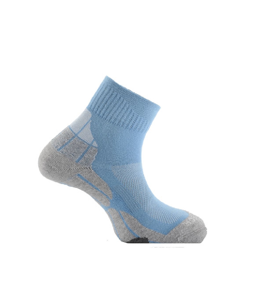 Wandersocke mit kurzem Schaft, ideal für Trail, Running, Radfahren oder Wandern für den aktiven Lebensstil. In der Farbe: hellblau-grau-creme.