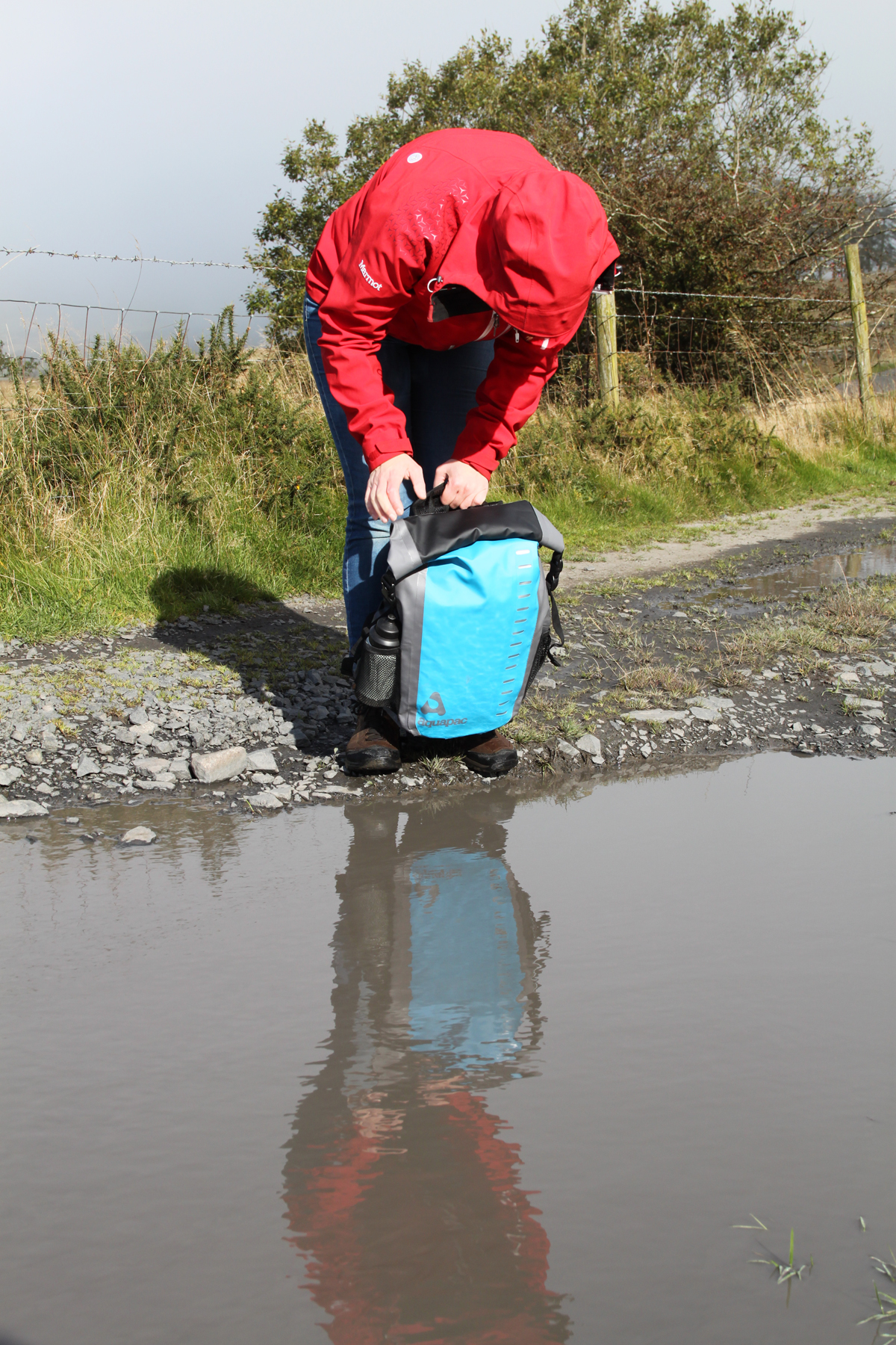Sie rollen das obere Ende der Tasche dreimal auf und schließen den Klickverschluss. Schon kann kein Regen oder Spritzwasser mehr eindringen.